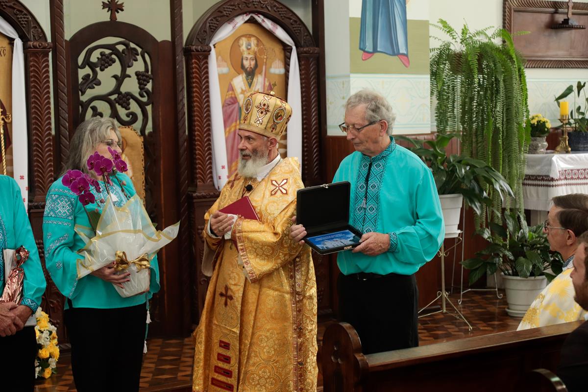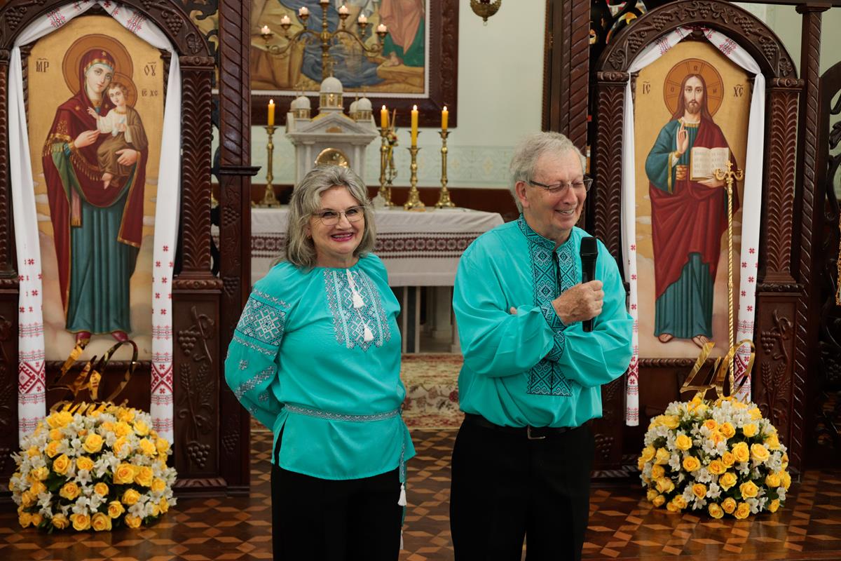 Prosseguindo, o Pároco Pe. Edson convidou à frente o Maestro Leonardo Davibida e sua esposa Sra. Joana para receberem a homenagem dos integrantes do Coral e da Comunidade paroquial. A homenagem, em nome dos coralistas, foi lida pelo coralista Marcos Nogas, que reconheceu e agradeceu pela “dedicação inestimável e colaboração generosa” do casal “a serviço da prática e da preservação do nosso rito ucraniano católico” durante quatro décadas, incluindo o trabalho com vários outros corais, além do Coral da Arquicatedral. Foi preparada em segredo, mas com muito carinho e reverência, uma homenagem especial – entoação da canção Рибалко-Pescador. A execução foi abrilhantada pelo acompanhamento musical do Sr. João Bohatczuk, que gentilmente aceitou o convite da coralista Maria Rosa Pastuch para participar junto com o Coral na homenagem ao Maestro e sua esposa. A canção teve o propósito de fazer uma analogia da missão do Maestro Leonardo com a missão de São Pedro de ser pescador de homens para a causa do Evangelho e Reino de Jesus Cristo. Dirigindo-se ao Maestro e sua esposa Joana, Marcos disse: “Assim como Pedro aceitou a missão, também você, Maestro Leonardo, incansavelmente, acolheu neste ‘barco chamado Coral’, pessoas da comunidade que comungam o desejo de louvar a Deus por meio da voz. É uma canção com um propósito nobre: agradecer pelo empenho, pela dedicação e pelo comprometimento que vocês têm demonstrado ao longo de sua caminhada conosco”.