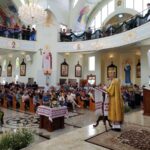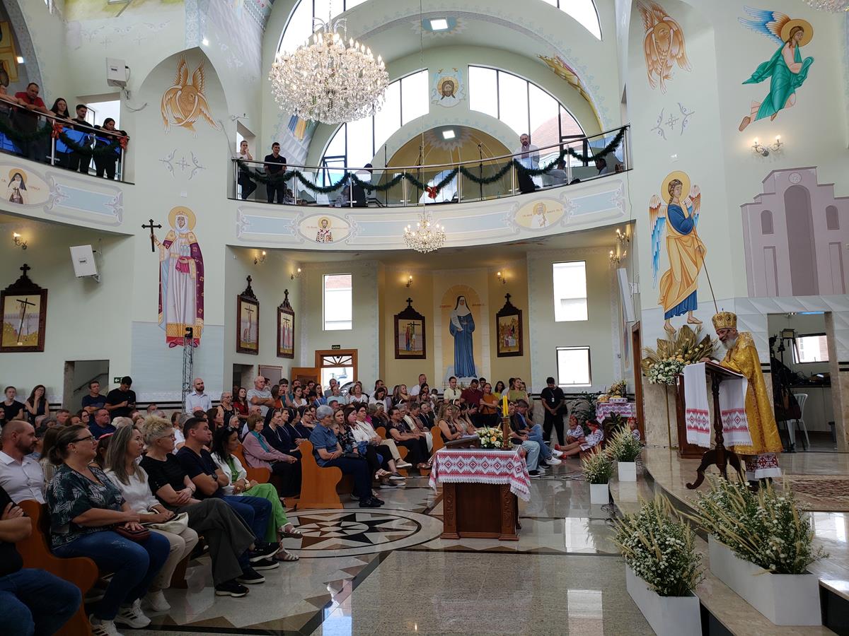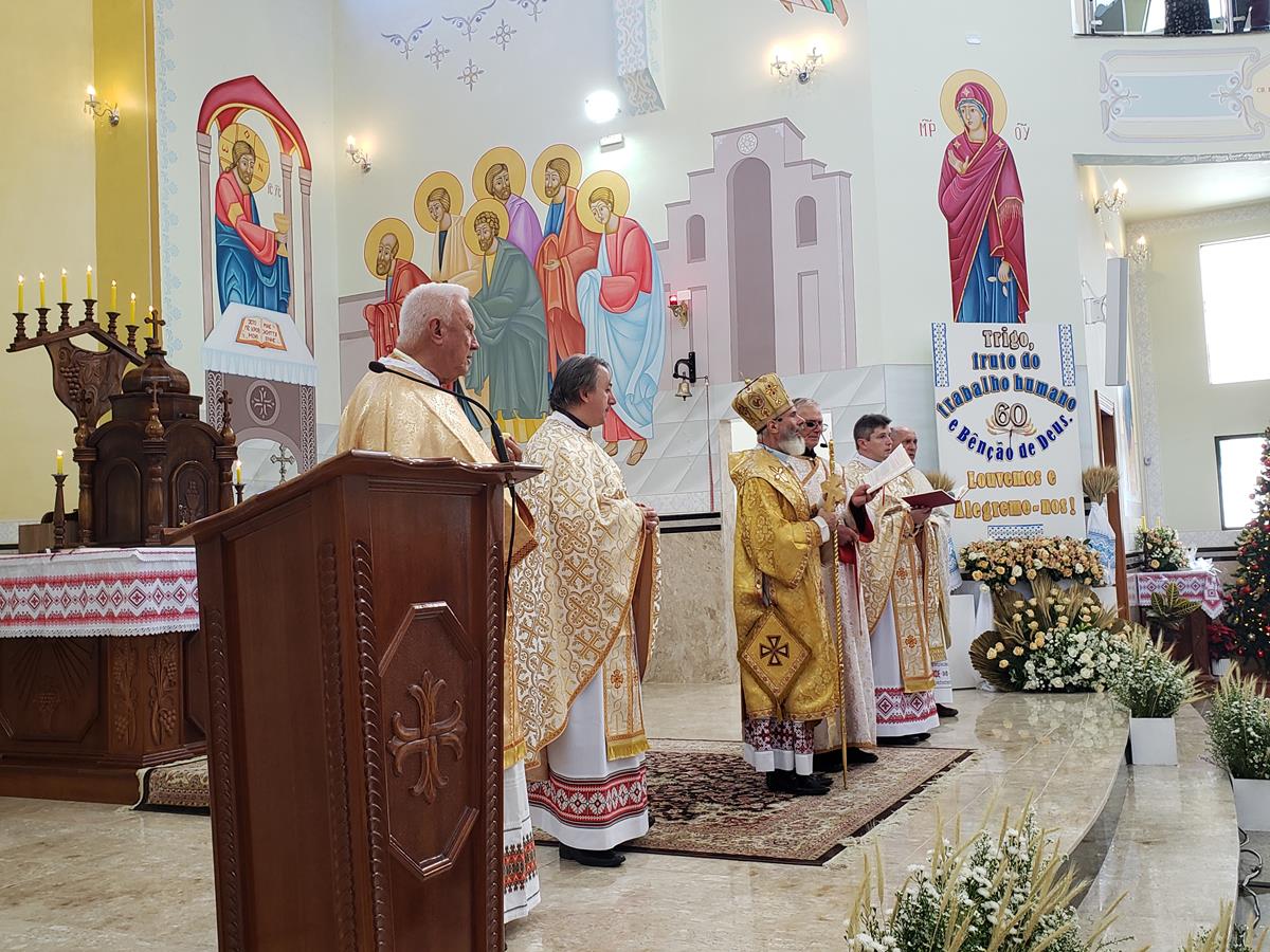 Às 09h30, tendo se paramentado na secretaria da catequese, subsolo da igreja, sob o repicar dos sinos, entoando cantos natalinos, os celebrantes saíram em procissão até o hall de entrada do majestoso templo consagrado à Santíssima Trindade. O Sr. Laertes Cardoso cumprimentou o Arcebispo Metropolita Dom Volodemer Koubetch e apresentou a história da Festa do Trigo. Ele concluiu falando sobre o significado dessa festividade para a comunidade paroquial: “O trigo é para nós o símbolo da resiliência e adaptação dos nossos antepassados e do povo desta terra. Nesta 60ª Festa do Trigo, celebramos não apenas a colheita das sementes ou as plantações, mas também as bênçãos que recebemos de Deus nestes 60 anos. É um momento de gratidão a Deus. Reconhecemos que tudo o que temos é um presente divino e Deus tem se mostrado muito generoso conosco. Que possamos, assim como o trigo, que ao ser semeado produz frutos, ser agentes de transformação, semeando o amor de Cristo, a esperança e a paz no mundo”.