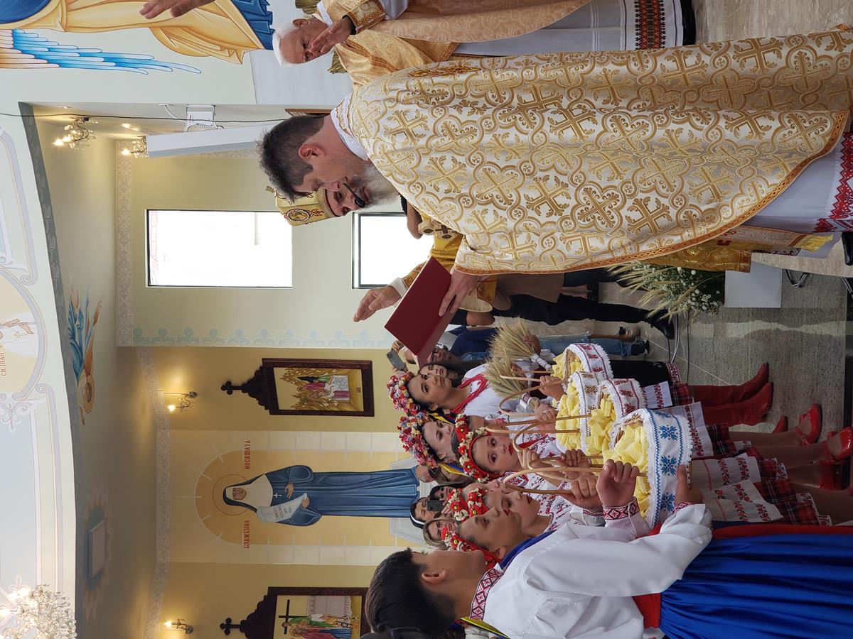 Ao final da celebração, com uma entoação do Mnohaia lita especialmente dedicada aos festeiros visitantes, com destaque ao Coral São Josafat, e outro dedicado à Paróquia Santíssima Trindade, anfitriã da histórica festividade, o Pároco Neomir fez seus agradecimentos. Motivando essas entoações, o Metropolita augurou às duas entidades que continuem por muitas décadas: o Coral com a herança da Ir. Celina e de outros maestros e cantores; e a Paróquia com a tradicional Festa do Trigo, uma riqueza com valores religiosos, culturais e culinários. Em seguida, juntamente com os sacerdotes, ele fez a bênção dos cachos de trigo e do korovai, que foram apresentados pelos catequizandos e dançarinos do Grupo Folclórico Ucraniano Soloveiko, belamente trajados com a indumentária ucraniana.