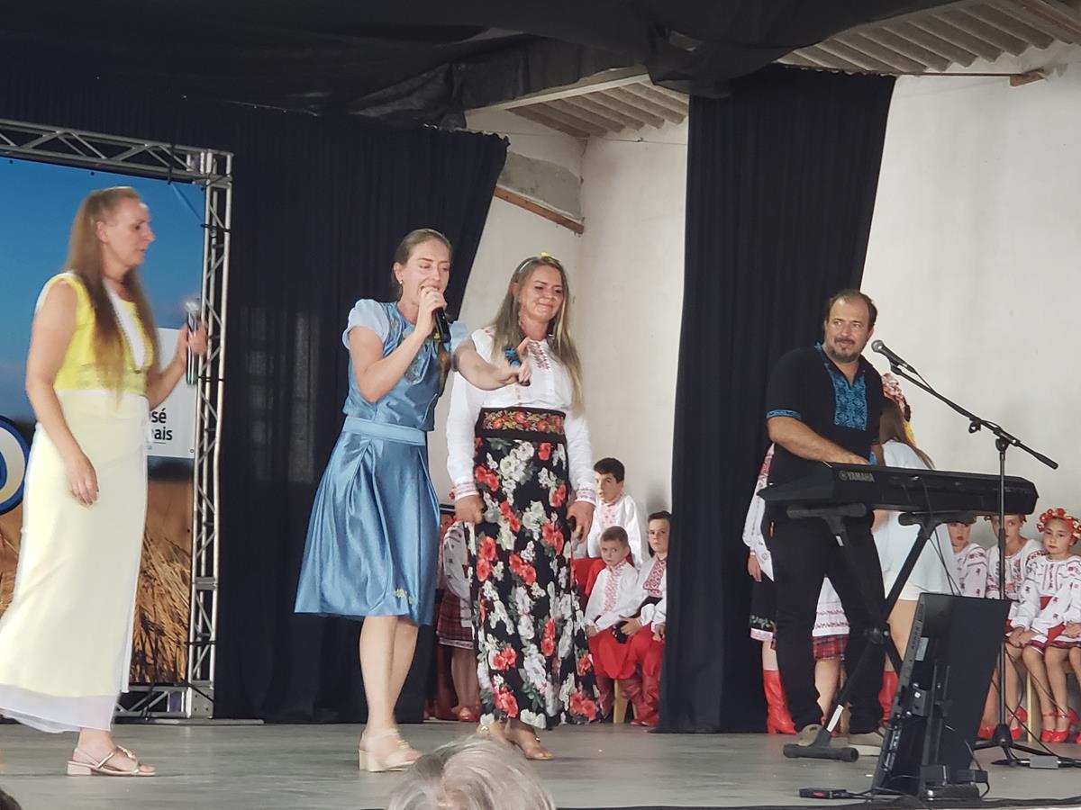 O almoço festivo foi servido no enorme salão paroquial e os festeiros puderam assistir à bela e animada apresentação do grupo musical “As Bossi & Luiz Fernando”, composto por Luiz Fernando Pereira, cantor e tecladista, e as irmãs Marli Isabel Bossi, Márcia Bossi, Rafaela Bossi. Este elenco é de Santa Terezinha, Santa Catarina, e é recente, atuando desde 2025, mas as irmãs Bossi cantam desde a infância. Durante muitos anos elas atuaram profissionalmente numa banda chamada Eclipse Cia Show. Após a pandemia, deram início a uma nova fase, dedicada especialmente à música e à cultura ucraniana. Marli define o estilo das apresentações do grupo da seguinte maneira: “Nosso estilo pode ser qualificado como Folk Contemporâneo Ucraniano – uma fusão entre o folclore tradicional e releituras modernas, preservando a tradição e a herança cultural, mantendo viva a alma do povo com energia atual de palco”. Sendo assim, em seu no repertório são interpretadas canções folclóricas ucranianas tradicionais, bem como adaptações de músicas conhecidas e versões com paródias em ucraniano. “Nosso propósito é valorizar e transmitir a душа народу – a alma do povo, fortalecendo a identidade, a fé e a alegria por meio da música”, conclui Marli.