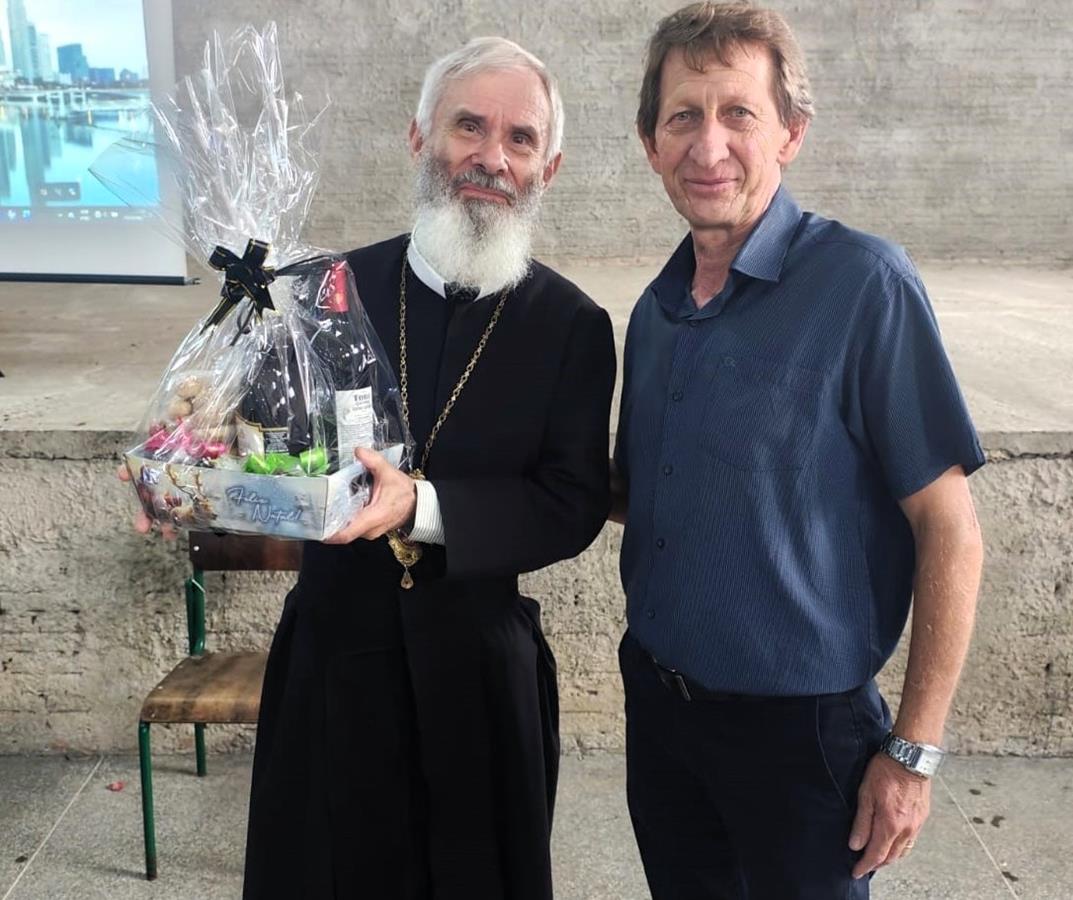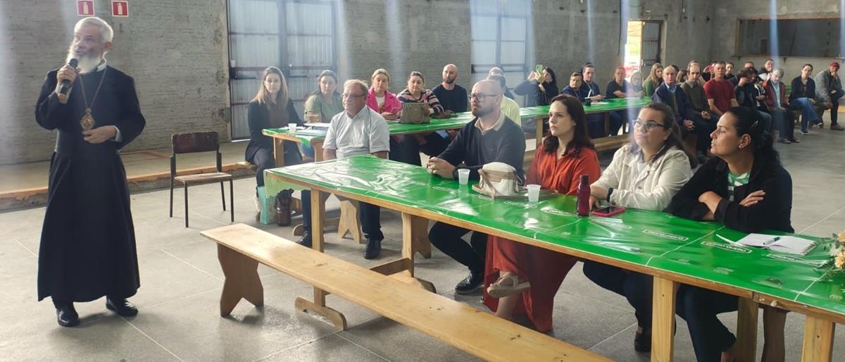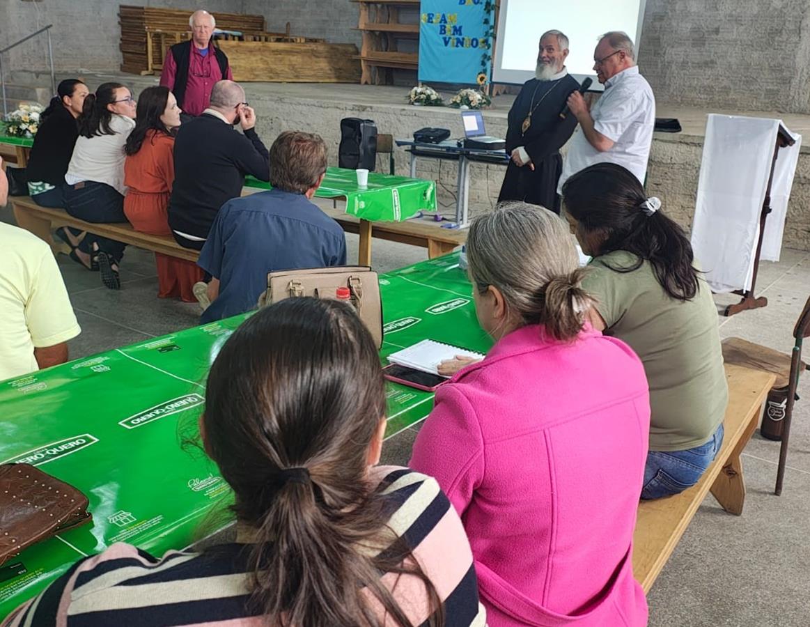 Em seguida, no centro de eventos da Paróquia, após a oração da Invocação do Espirito Santo, o Metropolita deu sequência ao evento, ressaltando os seguintes tópicos: peregrinos na sinodalidade, peregrinos na conversão, Igreja Sinodal, sinodalidade: essência da Igreja, fundamentada na Trindade, caminhar juntos, Metropolia sinodal, Paróquia sinodal, Conselho Pastoral Paroquial (CPP), um órgão consultivo canônico que cria sinodalidade.