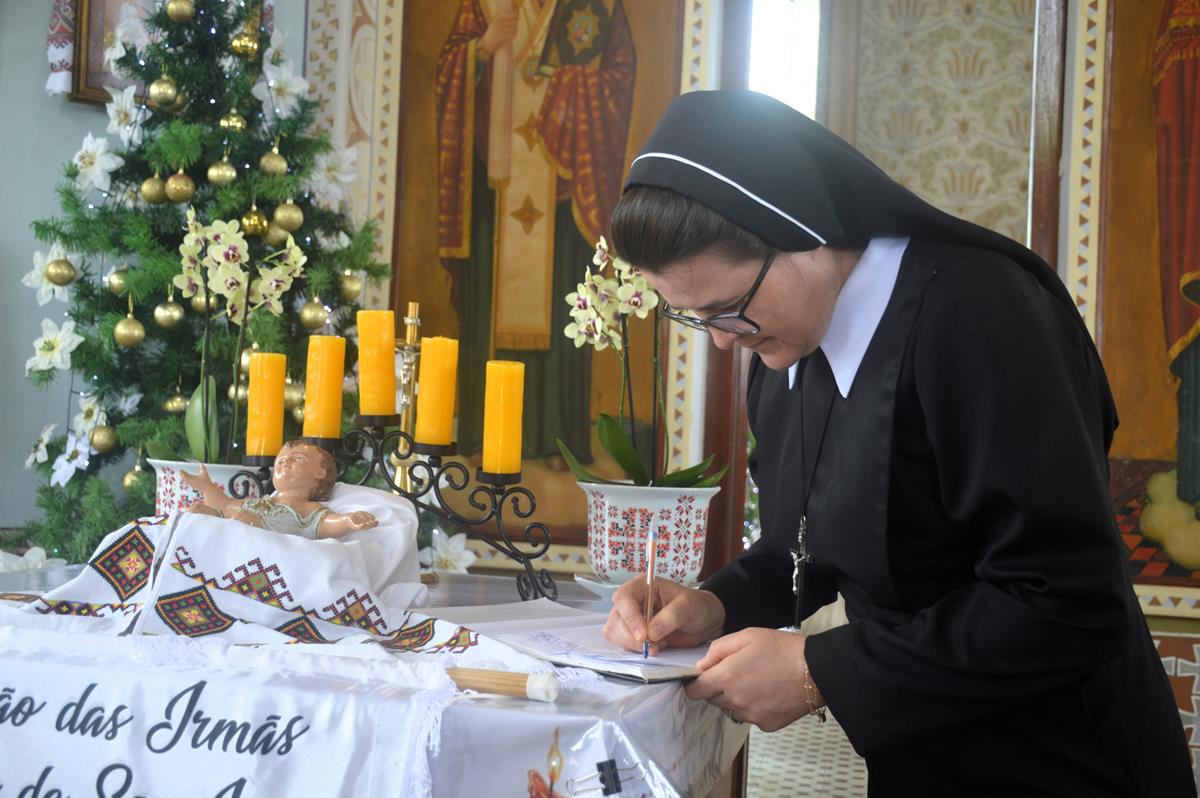 Em seguida, a Superiora Provincial Ir. Marta fez a leitura da Carta da Superiora Geral Ir. Marquiana Vasylychen com a data de 30 de dezembro de 2025, lida em ucraniano e na tradução portuguesa. Na primeira parte da carta, ela se dirige à Superiora Provincial e comunica sua alegria ao receber a notícia do início oficial da missão das Irmãs em Dorizon, faz um agradecimento ao Metropolita pelo “cuidado paternal” e proposta de assumir a missão, agradece aos paroquianos que acolheram as religiosas e assumiram o compromisso da sua manutenção. Na segunda parte, a Superiora Geral se dirige às Irmãs Eleutéria Karolus e Marina Litvin, que já estão atuando em Dorizon e aí irão permanecer, agradecendo-lhes pela resposta ao chamado de Deus em aceitar a missão e recomenda para que elas deem testemunho de Cristo pela consagração do coração, fidelidade à oração e à pregação. Ir. Marquiana conclui: “Conforme o carisma da nossa Congregação – amar, servir e louvar – levem o Cristo na simplicidade e alegria, assim como ensinou nosso Fundador Servo de Deus Pe. Cirilo Seletski. Que esta missão, sob a especial proteção de São José, produza copiosos frutos espirituais para toda a comunidade paroquial e seja para a glória de Deus”.