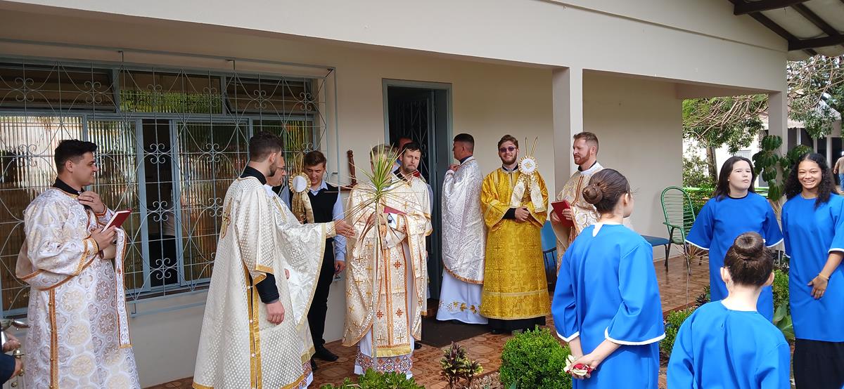 O rito teve início com a procissão da casa paroquial até a entrada da igreja. Mastros foram carregados pelos fiéis, enquanto o Bispo, padres, diácono e acólitos os seguiam. Ao chegar na porta, Dom Meron foi recebido pela comunidade local com pão e sal e cântico das crianças da catequese.