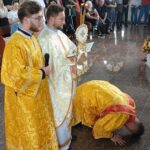 Após a consagração dos dons, foi iniciado o ritual da Ordenação Diaconal. O Reitor Pe. Edson conduziu Alexandre durante todo o rito. Entre os ritos de entrega dos paramentos, livros e objetos litúrgicos, o mais significativo foi o da imposição das mãos. Ajoelhado diante do altar e dos dons consagrados, Alexandre colocou a cabeça sobre o altar. O Bispo Dom Meron cobriu-lhe a cabeça com o “omoforion”, colocou as mãos sobre ele e proferiu a oração de consagração, invocando o Espírito Santo para que desça sobre seu servo e o transforme em diácono. Ordenado, o Diácono Alexandre começou a exercer suas funções litúrgicas.